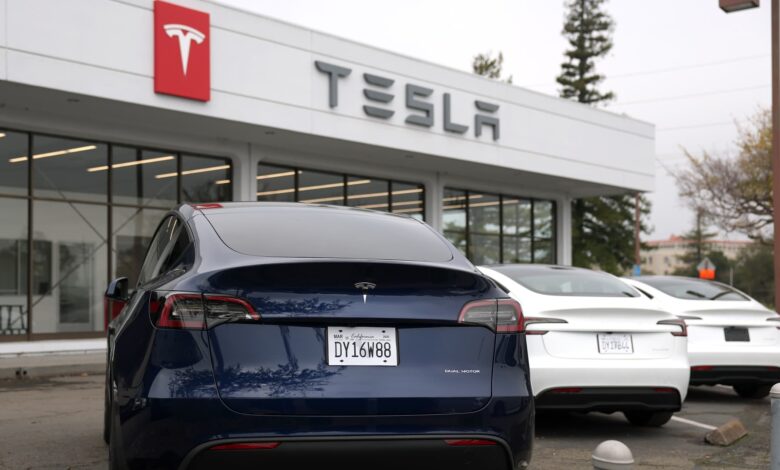 يتم عرض سيارات تسلا الجديدة في وكيل تسلا في 20 ديسمبر 2024 في كورت ماديرا، كاليفورنيا.