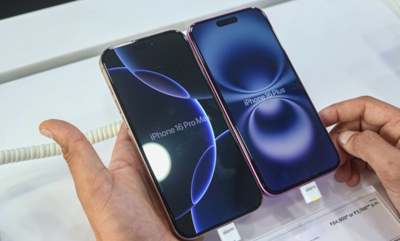 يقوم أحد العملاء بفحص أحدث سلسلة iPhone 16 Plus (يمين) من Apple وآخر iPhone 16 Pro Max (يسار) من Apple معروضة للبيع في متجر Master Arts في Srinagar و Jammu و Kashmir ، في 26 سبتمبر 2024.