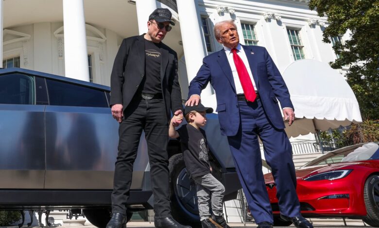 يتحدث الرئيس الأمريكي دونالد ترامب إلى وسائل الإعلام ، بجوار الرئيس التنفيذي لشركة تسلا إيلون موسك مع ابنه X æ A-12 ، في البيت الأبيض في واشنطن العاصمة ، الولايات المتحدة ، 11 مارس 2025.