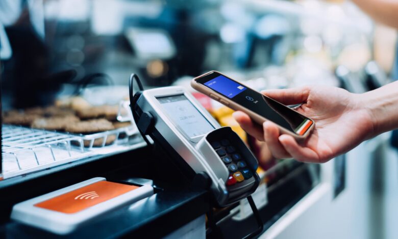 عن مقربة من يد المرأة تدفع مع هاتفها الذكي في مقهى ، مسح ودفع فاتورة على آلة البطاقات التي تقوم بدفعًا سريعًا وسهلاً بدون اتصال.
