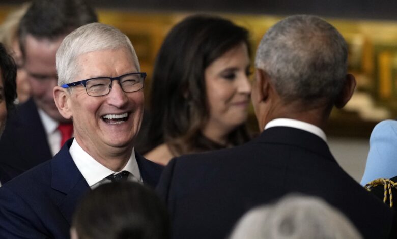 يحية تيم كوك ، الرئيس التنفيذي لشركة أبل ، الرئيس السابق باراك أوباما في افتتاح الرئيس الأمريكي دونالد ترامب في كابيتول روتوندا في واشنطن العاصمة ، في 20 يناير 2025.