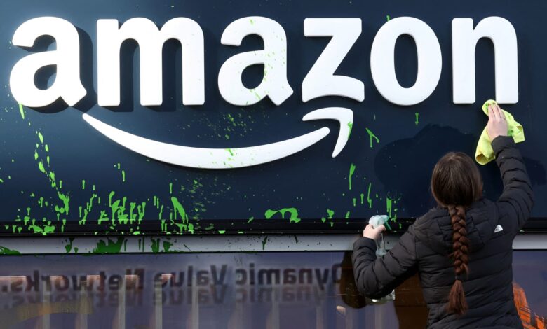 تقوم امرأة بتنظيف نافذة متجر Amazon House بعد أن قام الناشطون برش الطلاء على شعارها خلال احتجاج في يوم افتتاح الاجتماع السنوي الخامس والخمسين للمنتدى الاقتصادي العالمي في دافوس ، سويسرا ، في 20 يناير 2025.