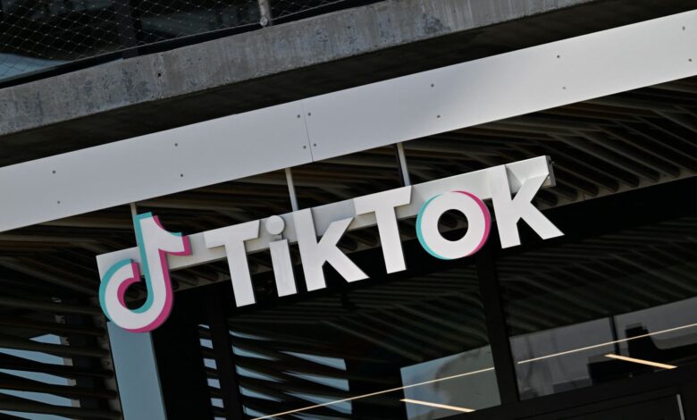 شوهد شعار Tiktok خارج مكاتب شركة Los Angeles التابعة لشركة تطبيقات الفيديو الصينية في 4 أبريل 2025 في Culver City ، كاليفورنيا.