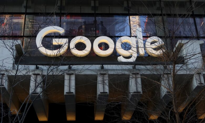 يتم تعليق شعار Google Corporate فوق مدخل مكتب الشركة في محطة سانت جون في مدينة نيويورك في 11 مارس 2025.