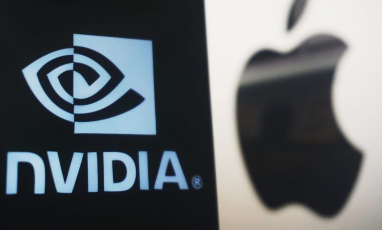 هانغتشو ، الصين – 3 يونيو 2024 – تم تصوير شعار NVIDIA وشعار Apple في مدينة Hangzhou ، مقاطعة تشجيانغ ، الصين ، 6 يونيو 2024. في 5 يونيو ، بالتوقيت الشرقي ، تجاوزت قيمة سوق الأسهم في NVIDIA 3 تريليون دولار ، تتجاوز قيمة سوق التفاح في العالم ، وأصبحت ثاني أكبر قيمة في السوق. تجدر الإشارة إلى أنه خلال ما يزيد قليلاً عن 3 أشهر ، ارتفعت القيمة السوقية لـ NVIDIA من 2 تريليون دولار إلى 3 تريليون دولار. (يجب أن يقرأ ائتمان الصورة CFOTO/Future Publishing عبر Getty Images)