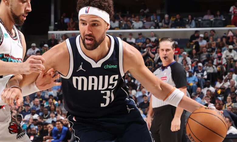 كلاي تومبسون #31 من دالاس مافريكس يتعامل مع الكرة خلال المباراة ضد ممفيس غريزليس خلال بطولة SOFI في 18 أبريل 2025 في FedExforum في Memphis ، تينيسي.