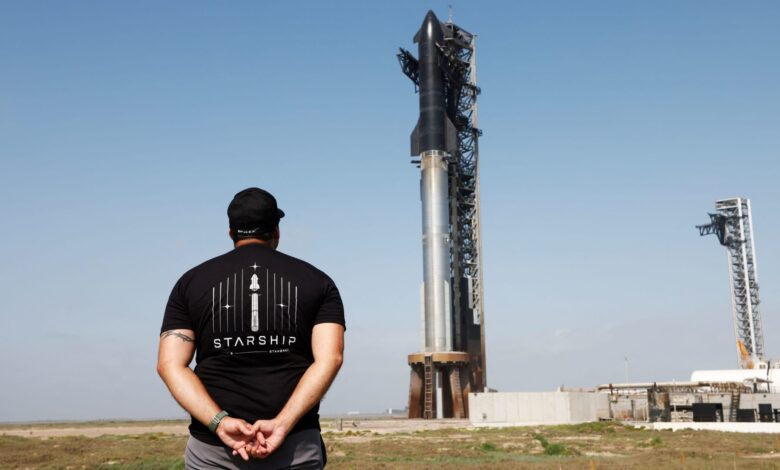 Matt Farrah من Newcastle ، ينظر أستراليا إلى مركبة الفضاء من الجيل القادم من SPACEX على قمة معززها الثقيل الفائقة التي يتم إطلاقها في اختبارها التاسع في منصة إطلاق الشركة في Starbase ، تكساس ، الولايات المتحدة الأمريكية ، 27 مايو ، 2025.