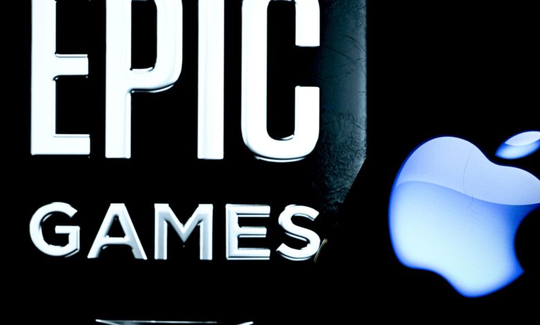 يظهر شعار متجر التطبيقات بجوار شعار Epic Games Store على شاشتين. يريد Epic ، صانع اللعبة الشهيرة “Fortnite” ، بيع العناصر الرقمية في تطبيقاتها دون إعطاء قطع من سعر الشراء إلى Apple.