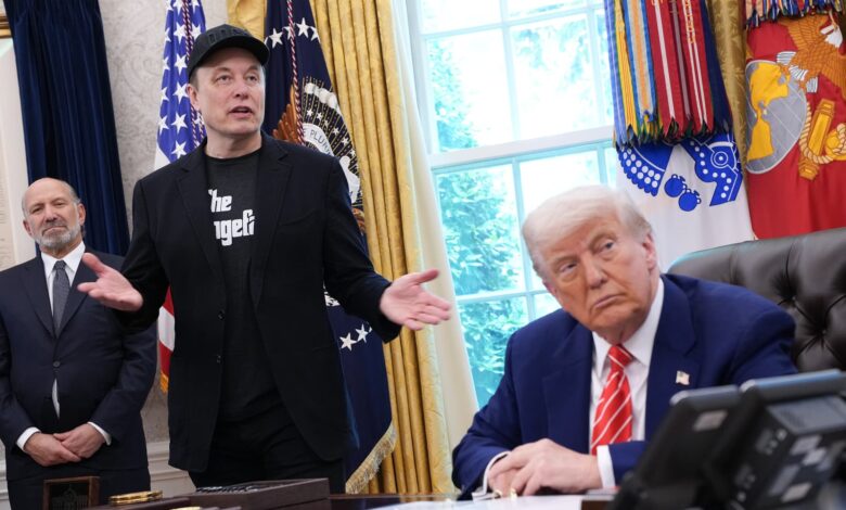 يتحدث الرئيس التنفيذي لشركة Tesla Elon Musk إلى جانب الرئيس الأمريكي دونالد ترامب للصحفيين في المكتب البيضاوي للبيت الأبيض في 30 مايو 2025 في واشنطن العاصمة.