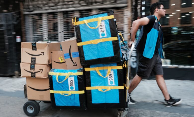 يقوم عامل Amazon بنقل الصناديق في يوم Amazon Prime في قرية East Village في مدينة نيويورك ، 11 يوليو 2023.