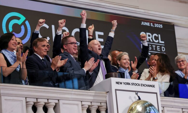 جيريمي ألير ، الرئيس التنفيذي والمؤسس المشارك لمجموعة سيركل إنترنت ، مُصدر أحد أكبر شركة Stablecoins في العالم ، شون نيفيل ، شارك نيفيل ، أحد مؤسسي شركة سيركل إنترنت ، حيث يرتكبون الجرس الافتتاحي ، في يوم الاكتتاب العام للشركة ، في مدينة نيويورك ، الولايات المتحدة ، 5 يونيو 2025.
