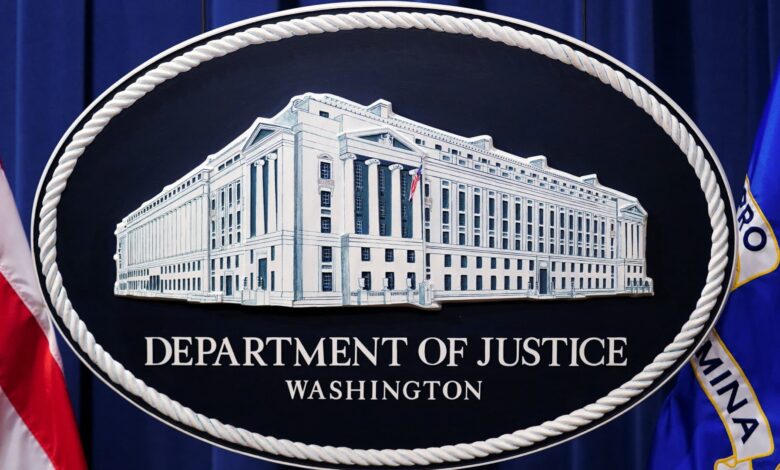 يظهر شعار وزارة العدل في الولايات المتحدة أو ختم يظهر مقر وزارة العدل ، والمعروف باسم “العدالة الرئيسية” ، وراء المنصة في غرفة الإحاطة المقر الرئيسي للوزارة أمام مؤتمر صحفي مع المدعي العام في واشنطن ، 24 يناير 2023.