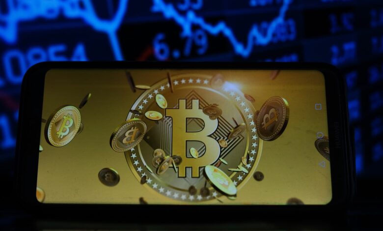 في هذا الصورة ، فإن شعار Bitcoin يتم عرضه على الهاتف الذكي مع نسب سوق الأوراق المالية في الخلفية.