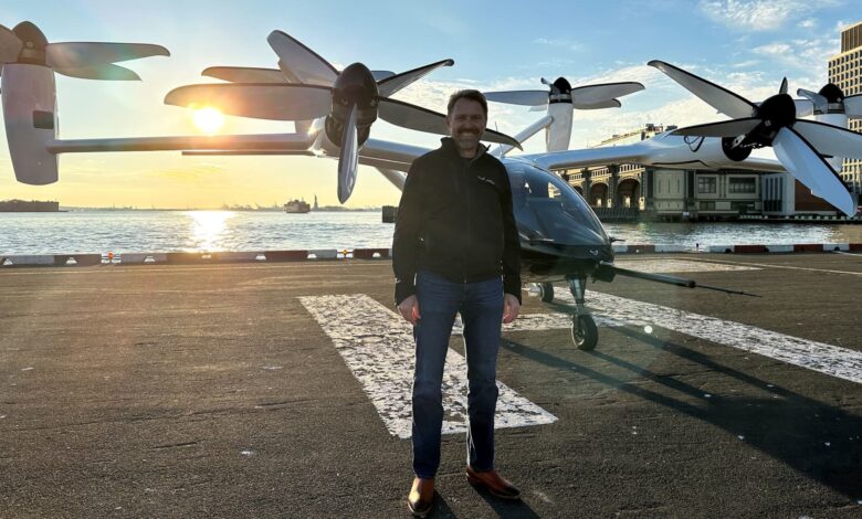 يقف Joeben Bevirt ، مؤسس ورئيس التنفيذي لشركة Joby Aviation ، بالقرب من سيارة أجرة كهربائية من قبل جوبي الطيران في وسط مدينة مانهاتن في مانهاتن ، مدينة نيويورك ، الولايات المتحدة ، 12 نوفمبر 2023.