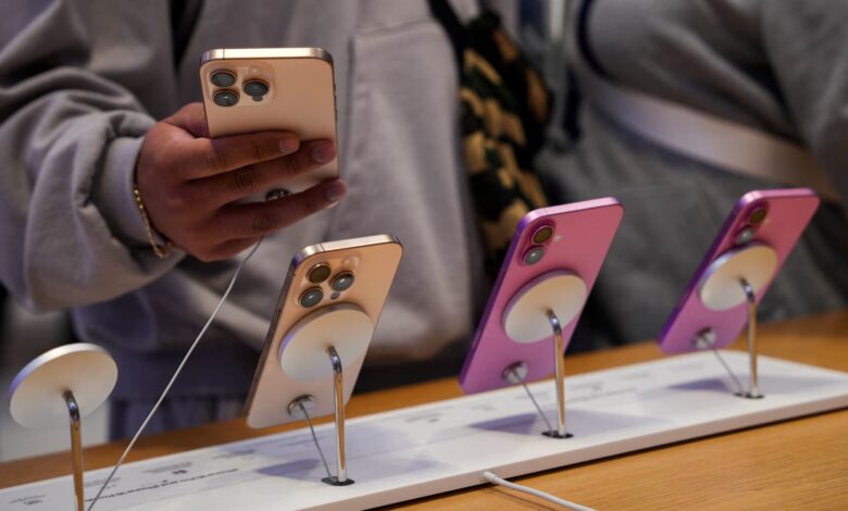 ينظر الناس إلى أجهزة iPhone في متجر Apple Fifth Avenue في مدينة نيويورك في 23 مايو 2025.