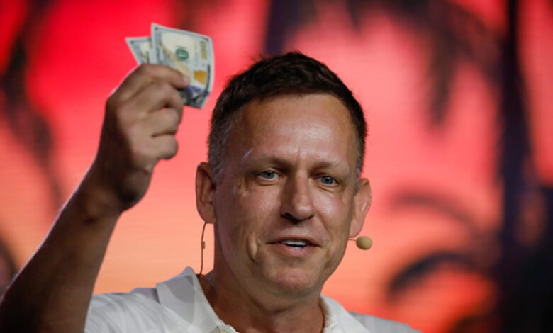 يمتلك بيتر ثيل ، رئيس ومؤسس Clarium Capital Management LLC ، مئات الدولارات فواتير وهو يتحدث خلال مؤتمر Bitcoin 2022 في ميامي ، فلوريدا ، الولايات المتحدة ، يوم الخميس ، 7 أبريل 2022.