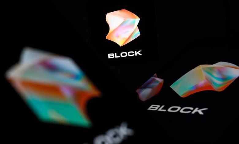 في هذا الرسم التوضيحي للصورة ، يتم عرض شعار “Block” في الولايات المتحدة “Block” وينعكس في عدد من الشاشات الرقمية في 03 مارس 2023 في لندن ، إنجلترا.