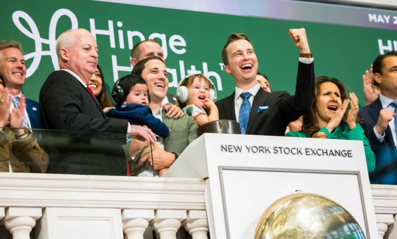يحتفل مؤسسون Hinge Health ، Gabriel Mecklenburg و Daniel Perez ، بمناسبةها العامة الأولية في بورصة نيويورك في 22 مايو 2025.