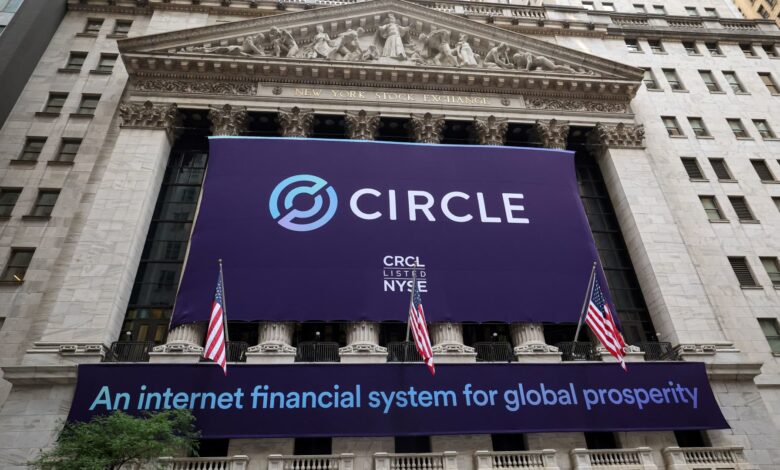 تتدلى لافتة لمجموعة Circle Internet Group ، وهي مصدرة واحدة من أكبر Stablecoins في العالم ، على مقدمة بورصة نيويورك للأوراق المالية (NYSE) للاحتفال باكتتاب الشركة في مدينة نيويورك ، الولايات المتحدة ، 5 يونيو 2025.