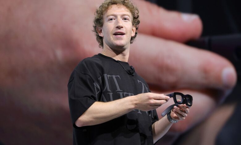 يحاول مارك زوكربيرج ، الرئيس التنفيذي لشركة Meta ، على نظارات Orion AR في الحدث السنوي لـ Meta Connect في مقر الشركة في مينلو بارك ، كاليفورنيا ، في 25 سبتمبر 2024.