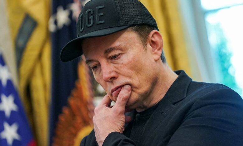 يتفاعل إيلون موسك خلال حدث صحفي مع الرئيس الأمريكي دونالد ترامب (غير مصور) ، في البيت الأبيض في واشنطن العاصمة ، الولايات المتحدة ، 30 مايو 2025.