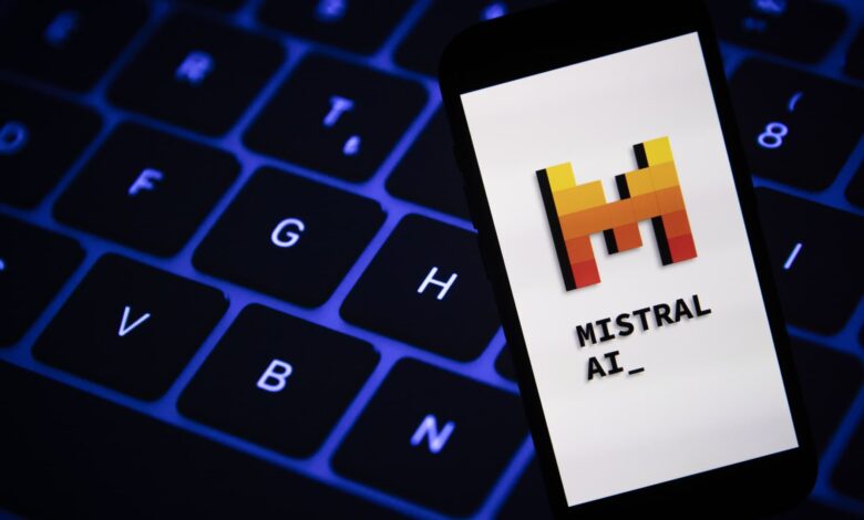 يتم عرض شعار Mistral AI على شاشة الهاتف المحمول.