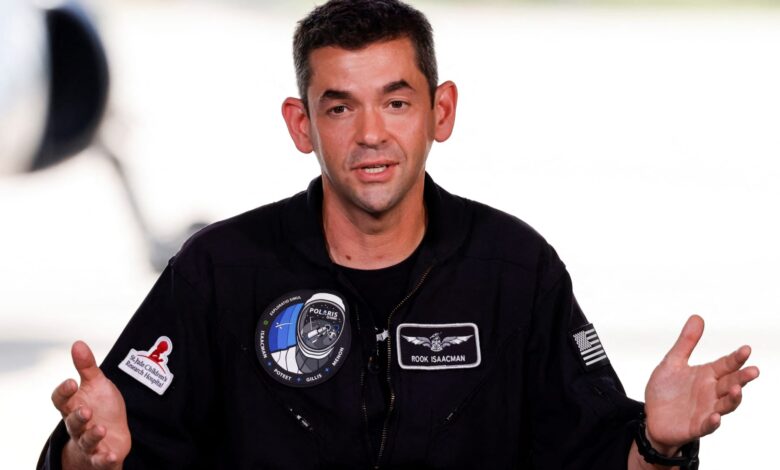 القائد جاريد إسحاقمان من بولاريس دون، وهي مهمة خاصة لرحلات الفضاء البشرية، يتحدث في مؤتمر صحفي في مركز كينيدي للفضاء في كيب كانافيرال، فلوريدا، الولايات المتحدة في 19 أغسطس 2024.