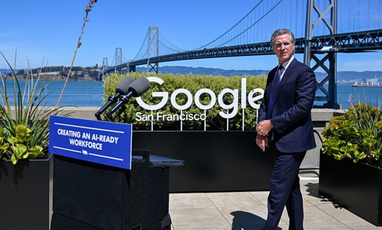 يتحدث الحاكم جافين نيوسوم في مكتب Google في سان فرانسيسكو حول “إنشاء قوة عمل جاهزة للذكاء الاصطناعي” وهو جهد مشترك جديد مع بعض شركات التكنولوجيا الرائدة في العالم للمساعدة في إعداد الطلاب والعاملين في كاليفورنيا بشكل أفضل للجيل القادم من التكنولوجيا، في سان فرانسيسكو، كاليفورنيا، الولايات المتحدة في 7 أغسطس 2025.