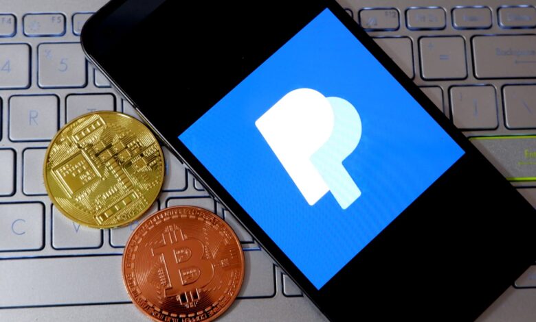 يظهر شعار Paypal معروضًا على هاتف ذكي بجوار العملات المشفرة.