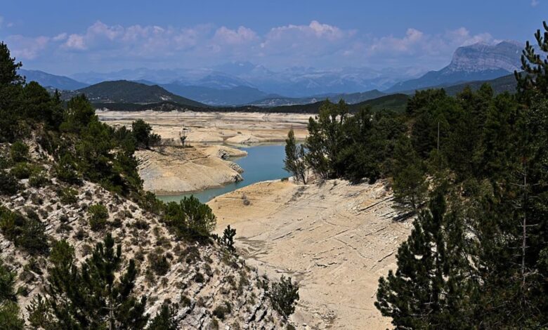 تُظهر هذه الصورة التي التقطت في 24 أغسطس 2025 منظرًا عامًا لخزان ميديانو، في المنطقة الشمالية الشرقية من أراغون بمقاطعة هويسكا.