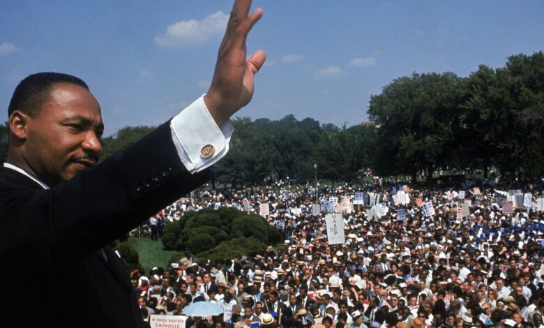 الدكتور مارتن لوثر كينغ جونيور يخاطب حشدًا من المتظاهرين خارج نصب لنكولن التذكاري خلال المسيرة إلى واشنطن من أجل الوظائف والحرية.