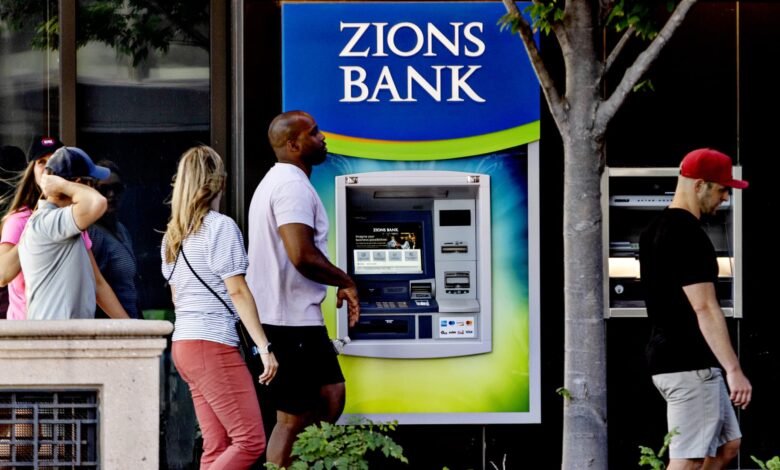 ماكينة صرف آلي في المقر الرئيسي لبنك زيونز في سولت ليك سيتي بولاية يوتا في 10 يوليو 2023.