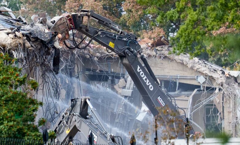هدم قسم من الجناح الشرقي للبيت الأبيض، أثناء إنشاء ملحق قاعة الاحتفالات الجديد بالبيت الأبيض في واشنطن العاصمة، الولايات المتحدة، يوم الثلاثاء 21 أكتوبر 2025.