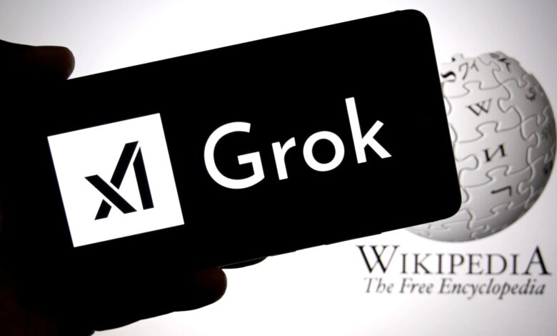 يظهر شعار Grok AI معروضًا على هاتف ذكي مع شعار ويكيبيديا في الخلفية.