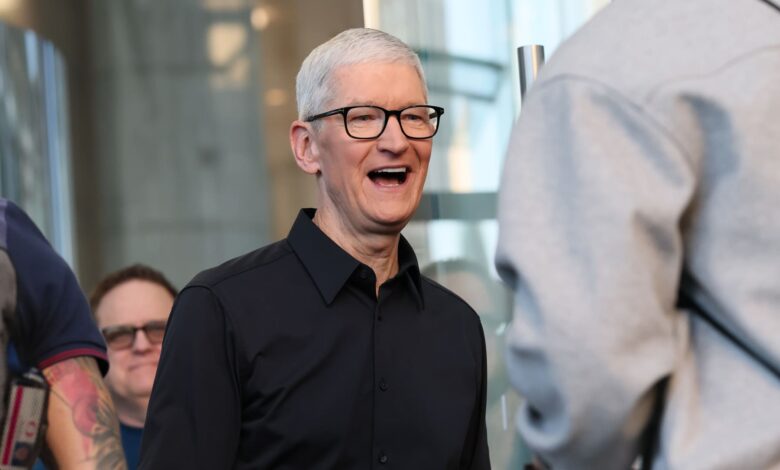 الرئيس التنفيذي لشركة Apple، تيم كوك، يرحب بالعميل في متجر Apple Store في Fifth Avenue في يوم إطلاق المنتج الجديد في 19 سبتمبر 2025 في مدينة نيويورك.