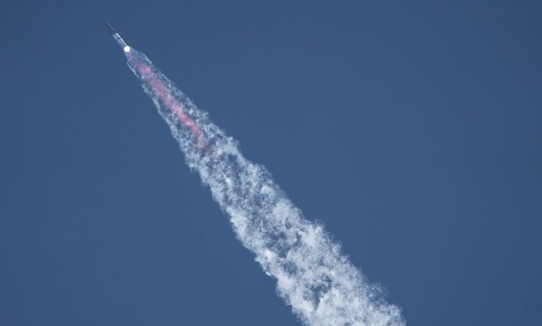 تم إطلاق صاروخ SpaceX’s Starship 38 خلال الرحلة التجريبية الحادية عشرة في 13 أكتوبر 2025 كما يُرى من جزيرة جنوب بادري في تكساس.