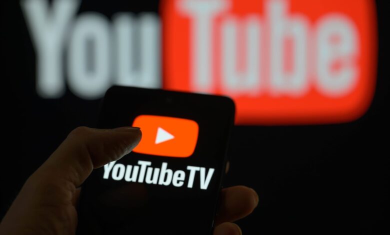 صورة توضيحية لشعار YouTube TV معروضة على هاتف ذكي، مع وجود شعار YouTube في الخلفية.