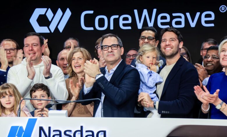 مايكل إنتراتور، المؤسس المشارك والرئيس التنفيذي لشركة CoreWeave، في الوسط، يظهر في Nasdaq MarketSite في نيويورك في 28 مارس 2025. جمعت CoreWeave 1.5 مليار دولار في طرحها العام الأولي، وهي صفقة مصغرة تعكس مدى تأثير تقلبات سوق الأسهم على الطلب حتى على عمليات الإدراج المتوقعة للغاية.