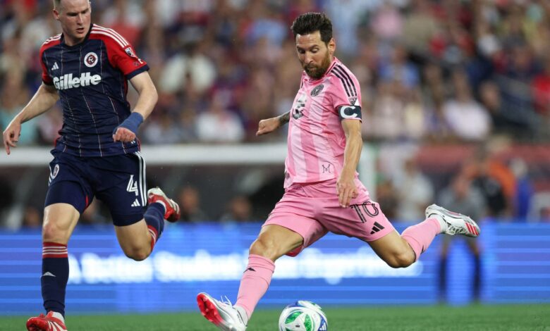 مهاجم إنتر ميامي ليونيل ميسي (10) يسجل هدفا خلال الشوط الأول ضد ثورة نيو إنجلاند على ملعب جيليت.