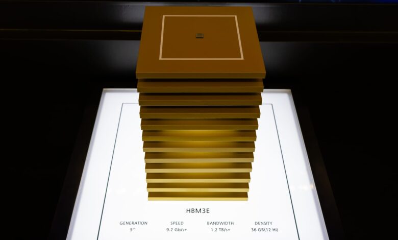 شريحة ذاكرة HBM3E مكونة من 12 طبقة من شركة SK Hynix معروضة في معرض أشباه الموصلات في سيول، كوريا الجنوبية.