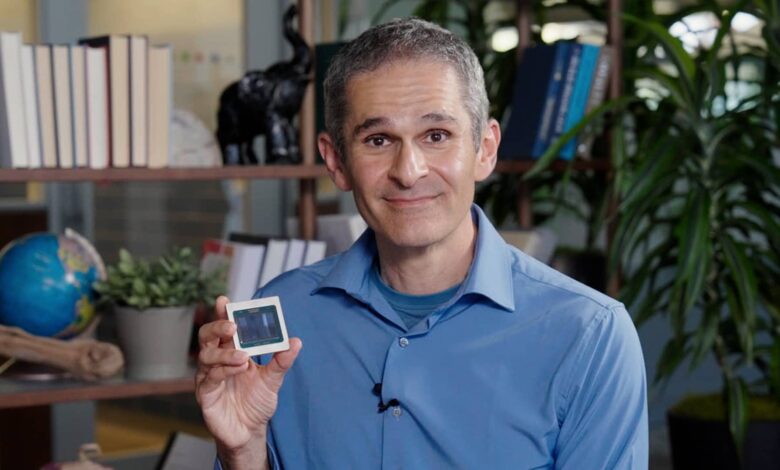 أمين فاهدات، نائب الرئيس للتعلم الآلي والأنظمة والذكاء الاصطناعي السحابي في Google، يحمل الإصدار 4 من مادة TPU في مقر Google في ماونتن فيو، كاليفورنيا، في 23 يوليو 2024.