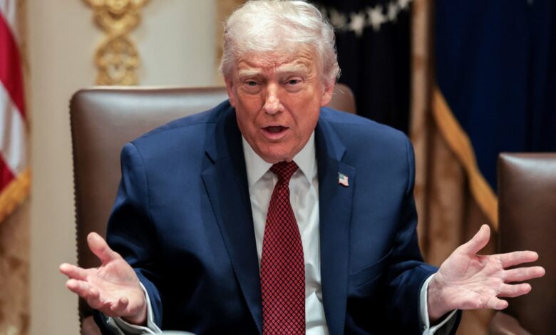 الرئيس الأمريكي دونالد ترامب يشير أثناء حضوره مناقشة مائدة مستديرة في اليوم الذي أعلن فيه عن حزمة مساعدات للمزارعين، في البيت الأبيض في واشنطن العاصمة، الولايات المتحدة، 8 ديسمبر 2025.