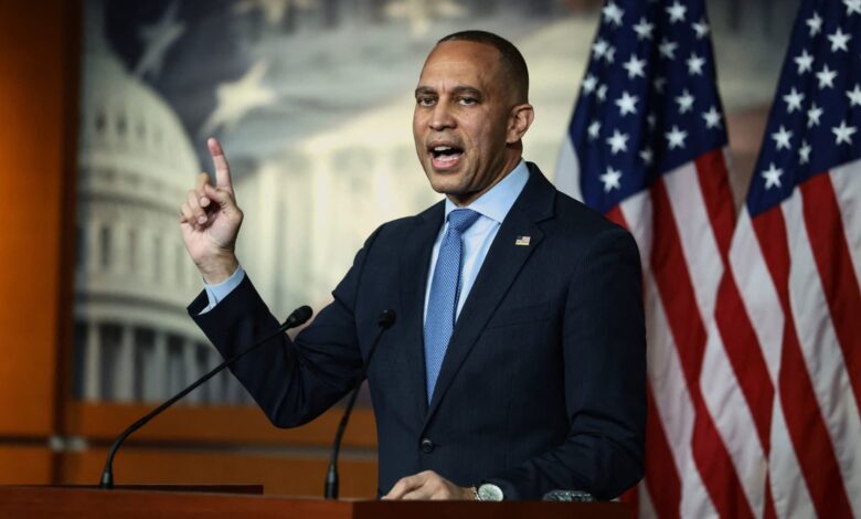 زعيم الأقلية في مجلس النواب الأمريكي حكيم جيفريز (ديمقراطي من نيويورك) يرفع إصبعه وهو يتحدث خلال مؤتمر صحفي، بعد أكثر من شهر من أطول إغلاق للحكومة الأمريكية في واشنطن العاصمة، الولايات المتحدة، 10 نوفمبر 2025.