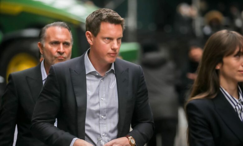 ديفيد إليسون، رئيس مجلس الإدارة والرئيس التنفيذي لشركة باراماونت سكاي دانس، في الوسط، خارج بورصة نيويورك (NYSE) في نيويورك، الولايات المتحدة، يوم الاثنين، 8 ديسمبر 2025.