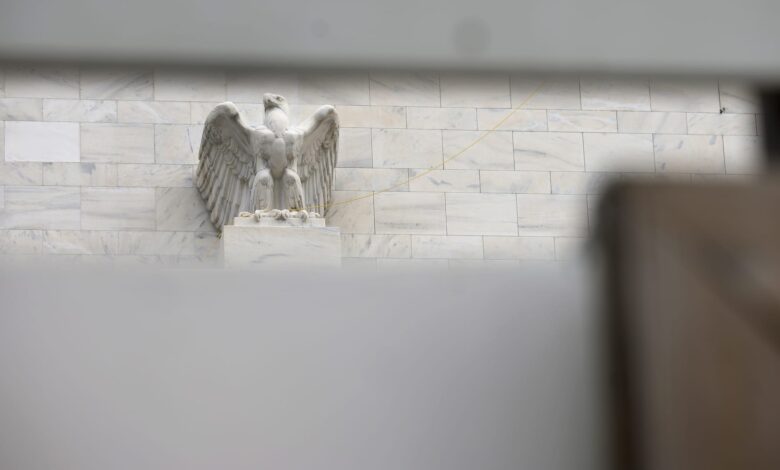 نسر يظهر في إطار من خلال سياج البناء في مبنى مجلس الاحتياطي الفيدرالي مارينر إس إكليس، المكاتب الرئيسية لمجلس محافظي نظام الاحتياطي الفيدرالي في 16 سبتمبر 2025 في واشنطن العاصمة، الولايات المتحدة
