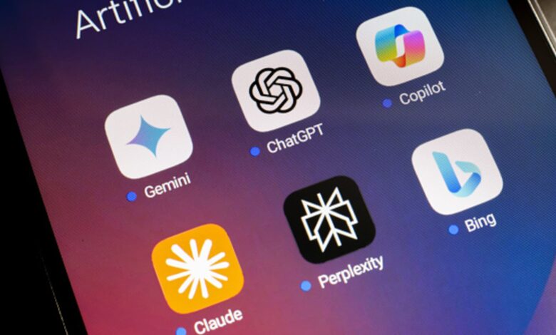 يتم عرض شعارات تطبيقات Google Gemini وChatGPT وMicrosoft Copilot وClaude by Anthropic وPerplexity وBing على شاشة هاتف ذكي في رينو بالولايات المتحدة في 21 نوفمبر 2024.