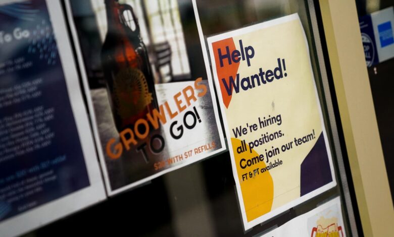 لافتة توظيف موظفين تظهر في نافذة شركة في أرلينغتون، فيرجينيا، في 7 أبريل 2023.