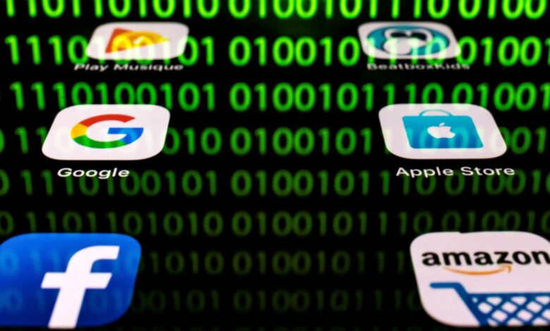 يُظهر هذا الرسم التوضيحي الذي تم التقاطه في 20 أبريل 2018 في باريس تطبيقات Google وAmazon وFacebook وApple، بالإضافة إلى انعكاس رمز ثنائي معروض على شاشة الكمبيوتر اللوحي.