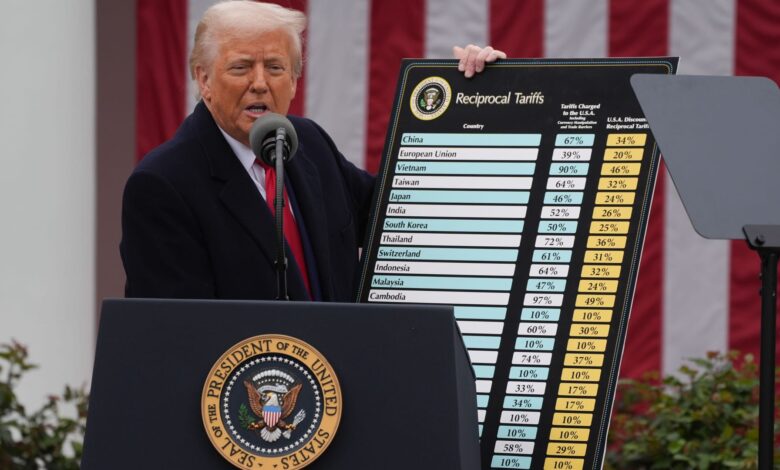 يحمل الرئيس دونالد ترامب رسمًا بيانيًا أثناء إعلانه عن خطة لفرض تعريفات جمركية على السلع المستوردة خلال حدث في 2 أبريل 2025، في حديقة الورود بالبيت الأبيض.